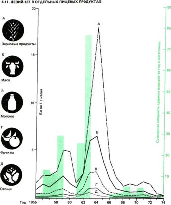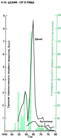 Содержание цезия-137 в различных продуктах питания (Дания). Для сравнения приведена годовая мощность ядерных взрывов в атмосфере
