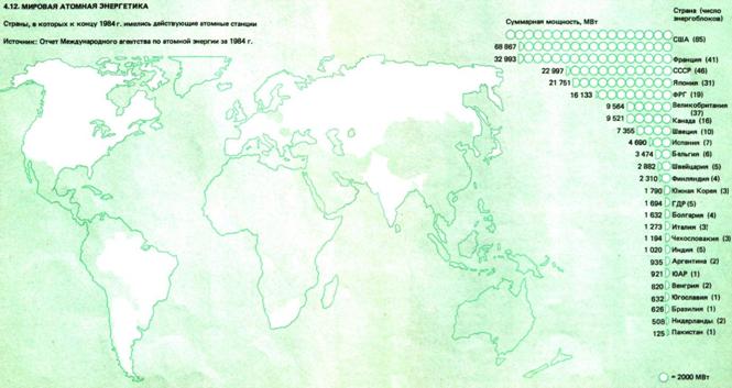 К концу 1984 года в 26 странах работало 345 ядерных реакторов, вырабатывающих электроэнергию. Их мощность составляла 13% суммарной мощности всех источников электроэнергии и была равна 220 ГВт (рис. 4.12). До сих пор каждые ~ 5 лет эта мощность удваивалась, однако, сохранится ли такой темп роста в будущем, неясно. Оценки предполагаемой суммарной мощности атомных электростанций на конец века имеют постоянную тенденцию к снижению. Причины тому - экономический спад, реализация мер по экономии электроэнергии, а также противодействие со стороны общественности. Согласно последней оценке МАГАТЭ (1983 г.), в 2000 году мощность атомных электростанций будет составлять 720-950 ГВт.