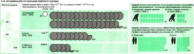 За период с 1975 по 1979 год на каждый гигаватт-год выработанной энергии уровень загрязнений от завода в Уиндскейле по β-активности примерно в 3,5 раза, а по α-активности в 75 раз превышал уровень загрязнений от завода в Ла-Аге (рис. 4.13.).