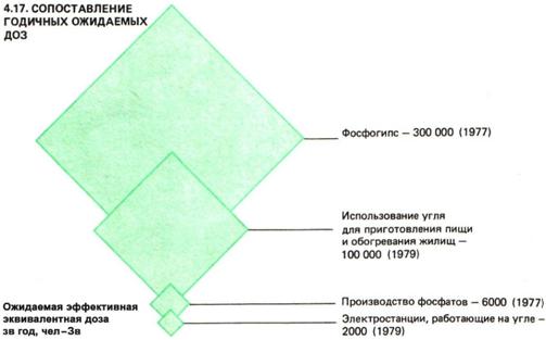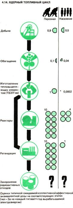 Оценки показывают, что доза, которую получают рабочие урановых рудников и обогатительных фабрик, составляет в среднем 1 чел-Зв на каждый гигаватт-год электроэнергии. Примерно 90% этой дозы приходится на долю рудников, причем персонал, работающий в шахтах, подвергается большему облучению. Коллективная эквивалентная доза от заводов, на которых получают ядерное топливо, также составляет 1 чел-Зв на гигаватт-год (рис. 4.14).