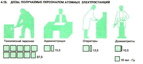 Эта оценка, распространяющая коллективную профессиональную дозу на все население, не отражает того факта, что люди, работающие на предприятиях атомной энергетики, получают по роду своей деятельности большую дозу, чем от естественных источников. При этом самые высокие средние дозы - в шесть раз выше естественного фона - всегда получали рабочие подземных урановых рудников, но сейчас такие же дозы характерны и для рабочих завода в Уиндскейле. При разработках открытых месторождений, на заводе в Ла-Аге, а также на АЭС с PWR, BWR и HWR персонал получает профессиональную среднюю дозу, вдвое большую, чем от естественных источников. И только персонал АЭС, в которых применяются реакторы с газовым охлаждением, и работники заводов по производству ядерного топлива получают дополнительные средние дозы, приблизительно равные дозам от естественных источников. Понятно, что средние оценки профессиональных доз не отражают большого разброса индивидуальных доз.
