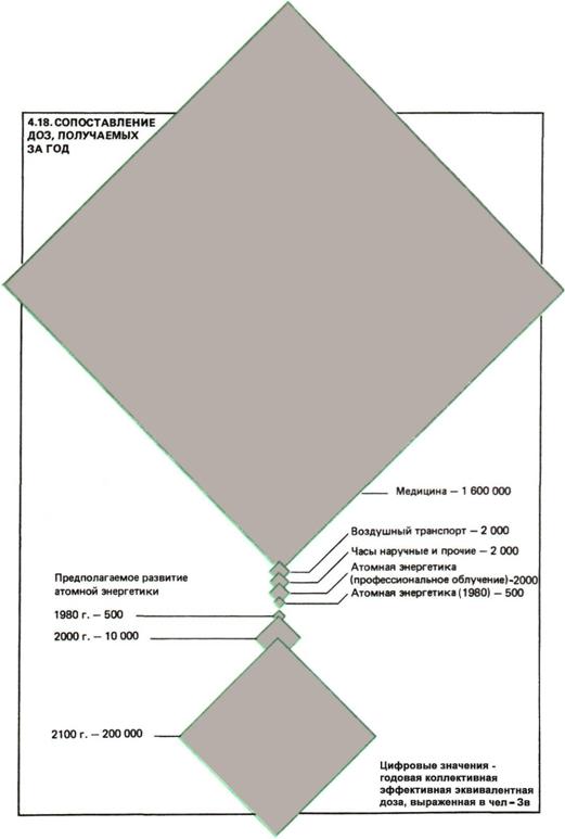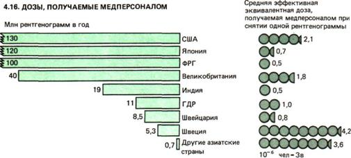 Конечно, профессиональные дозы получают не только рабочие предприятий атомной промышленности. Облучению подвергаются и работники обычных промышленных предприятий, а также медицинский персонал. Последние составляют многочисленную группу (по крайней мере 100000 человек в США, еще больше в Японии и ФРГ), получая в среднем относительно небольшие дозы (рис. 4.16). Для стоматологов среднегодовые дозы облучения еще меньше. В целом считается, что вклад дозы, получаемой медицинским персоналом, занимающимся радиологическими обследованиями, в коллективную эквивалентную дозу населения в странах с высоким уровнем медицинского обслуживания составляет около 1 чел-Зв на миллион жителей.