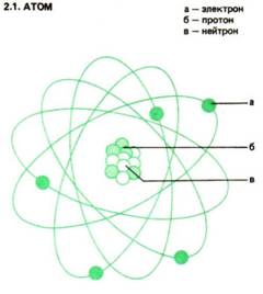 Главным объектом исследования ученых был сам атом, вернее - его строение. Мы знаем теперь, что атом похож на Солнечную систему в миниатюре: вокруг крошечного ядра движутся по орбитам «планеты»-электроны. Размеры ядра в сто тысяч раз меньше размеров самого атома, но плотность его очень велика, поскольку масса ядра почти равна массе всего атома. Ядро, как правило, состоит из нескольких более мелких частиц, которые плотно сцеплены друг с другом (рис. 2.1).