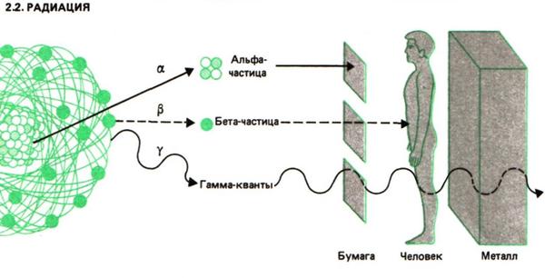 Разные виды излучений сопровождаются высвобождением разного количества энергии и обладают разной проникающей способностью, поэтому они оказывают неодинаковое воздействие на ткани живого организма (рис. 2.2). Альфа-излучение, которое представляет собой поток тяжелых частиц, состоящих из нейтронов и протонов, задерживается, например, листом бумаги и практически не способно проникнуть через наружный слой кожи, образованный отмершими клетками. Поэтому оно не представляет опасности до тех пор, пока радиоактивные вещества, испускающие α-частицы, не попадут внутрь организма через открытую рану, с пищей или с вдыхаемым воздухом; тогда они становятся чрезвычайно опасными. Бета-излучение обладает большей проникающей способностью: оно проходит в ткани организма на глубину один - два сантиметра. Проникающая способность гамма-излучения, которое распространяется со скоростью света, очень велика: его может задержать лишь толстая свинцовая или бетонная плита.