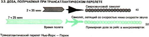 При перелете из Нью-Йорка в Париж пассажир обычного турбореактивного самолета получает дозу около 50 мкЗв, а пассажир сверхзвукового самолета – на 20% меньше, хотя подвергается более интенсивному облучению. Это объясняется тем, что во втором случае перелет занимает гораздо меньше времени (рис. 3.3). Всего за счет использования воздушного транспорта человечество получает в год коллективную эффективную эквивалентную дозу около 2000 чел-Зв.