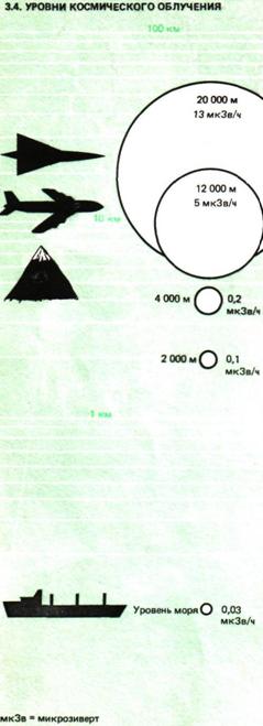 Люди, живущие на уровне моря, получают в среднем из-за космических лучей эффективную эквивалентную дозу около 300 микрозивертов (миллионных долей зиверта) в год; для людей же, живущих выше 2000 м над уровнем моря, это величина в несколько раз больше. Еще более интенсивному, хотя и относительно непродолжительному облучению, подвергаются экипажи и пассажиры самолетов. При подъеме с высоты 4000 м (максимальная высота, на которой расположены человеческие поселения: деревни шерпов на склонах Эвереста) до 12000 м (максимальная высота полета трансконтинентальных авиалайнеров) уровень облучения за счет космических лучей возрастает примерно в 25 раз и продолжает расти при дальнейшем увеличении высоты до 20000 м (максимальная высота полета сверхзвуковых реактивных самолетов) и выше (рис. 3.4).