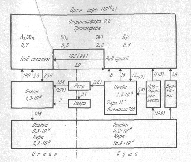 Рис.14. Основные резервуары (1012 г) и глобальные потоки соединений серы (Заварзин, 1984, 1012 г./год)