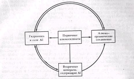 Алюминий — один из наиболее распространенных элементов на нашей планете и по содержанию в земной коре стоит на третьем месте после кислорода и кремния. В почве он находится в составе первичных и вторичных минералов, гидроокиси и алюмоорганических соединений, которые взаимно связаны (рис. 15). Мобилизация алюминия из кристаллических решеток алюмосиликатных минералов происходит при участии почвенных микроорганизмов, метаболиты которых либо образуют комплексные соединения непосредственно с алюминием либо выносят другие элементы из минералов, а алюминий, освобождаясь, связывается в металлорганические комплексы продуктами разложения растений или гумусовыми кислотами почв. В основе такого преобразования лежат реакции хелатизации. В форме металлорганических соединений алюминий приобретает подвижность и мигрирует в широком диапазоне рН. Эти процессы наиболее выражены в почвах зон влажного климата и связаны с подзоло - и латеритообразованием. В подзолистых почвах алюминий мигрирует в виде комплексных соединений с гумусовыми кислотами и накапливается в значительных количествах в иллювиальном горизонте в форме алюмоорганических комплексов с фульвокислотами.