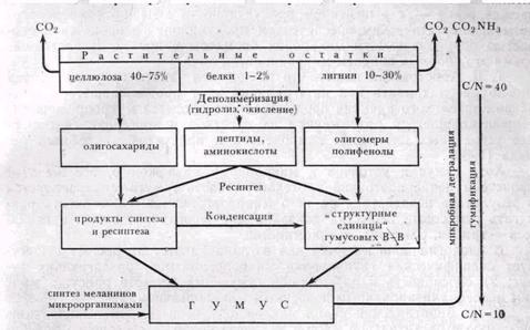 Рис.16. Схема образования и разложения гумуса (Бабьева, Зенова, 1983)