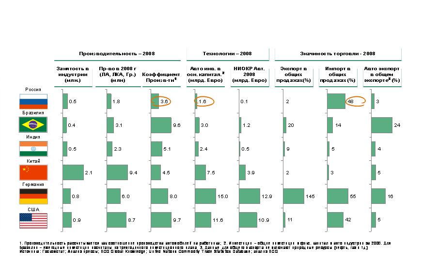 Рис. № 6. Сравнение отдельных показателей автомобильной промышленности в ведущих странах.