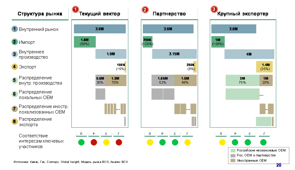 - распределения объемов внутреннего производства между различными категориями производителей, а именно российскими независимыми ОЕМ (такими как, ), совместными предприятиями между российскими ОЕМ и иностранными (например, проект Фиат-Соллерс), и иностранными ОЕМ, осуществляющими проекты в России (Форд);