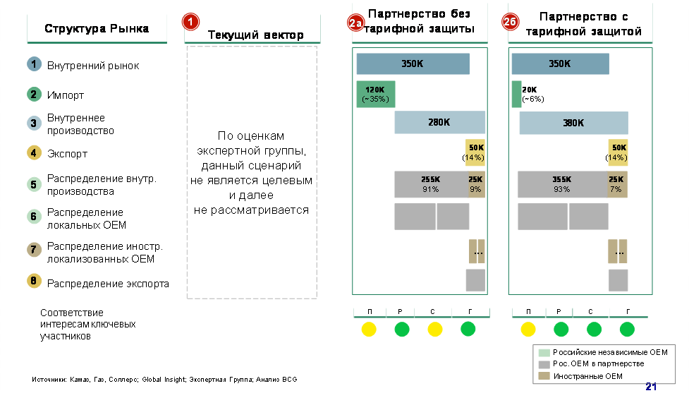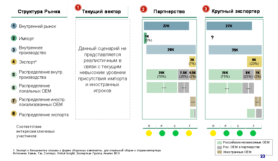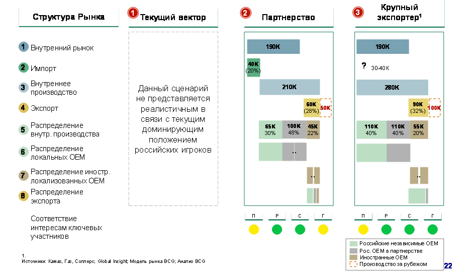 - для сегмента грузовых автомобилей, учитывая текущее положение российских ОЕМ и их конкурентных преимуществ, наиболее эффективным является сценарий «Крупный экспортер». В значительной мере данный сценарий может реализоваться за счет прямых иностранных инвестиций;