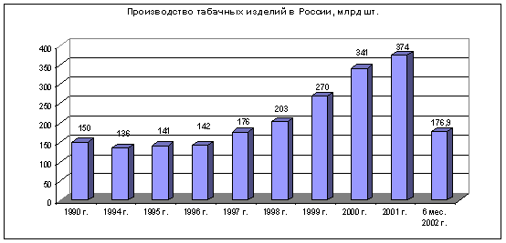 По мнению специалистов, в 2002 г. ожидается некоторое снижение объема производства табачных изделий в России. Между тем табачные фабрики пока не идут на сокращение производства, что означает для них снижение прибыли. Так, за 1-ое полугодие 2002 г. было произведено 177 млрд шт. сигарет, что на 2,5% больше, чем за аналогичный период 2001 г.