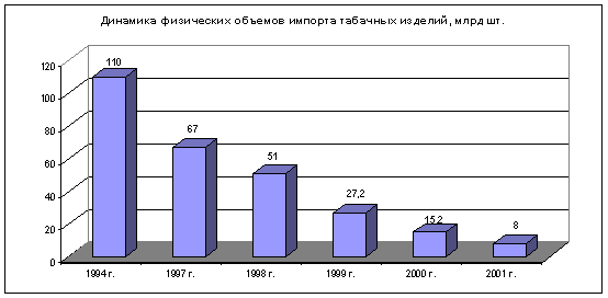 О существовании в России серьезной проблемы перепроизводства табачных изделий свидетельствуют, в частности, рост товарных остатков на складах производителей. Так, согласно данным МНС, по состоянию на 1 января 2001 г. у компаний было 3,2 млрд шт. нераспроданных запасов, а к 1 января 2002 г. они выросли до 16,4 млрд шт.