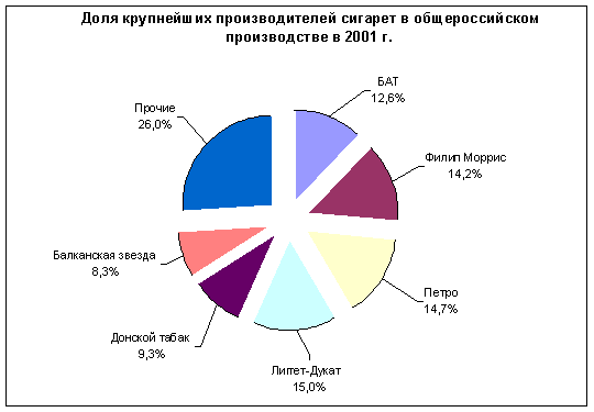 В России постоянно курят около 44 млн человек, что составляет примерно 30% населения, из них 63% мужчин и 9,7% женщин. 45% предпочитают сигареты отечественного производства, 35% - импортного, 20% не отличаются устойчивыми пристрастиями. Спрос россиян на табачные изделия обеспечивается по 3-м направлениям: отечественное производство, импорт и контрабандная или незаконно произведенная продукция.