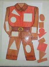 Когда пожарные тушили пожар, порвали свой комбинезон и его нужно «починить»: на столе комбинезон, на нём дырки разнообразной формы. Детям раздаются геометрические фигуры соответствующих форм. Необходимо правильно подобрать заплатки.