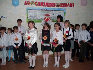 Ведущий 1. Сегодня в нашем зале есть ещё выпускники. Правда, они пока не покидают стены нашей школы, но уже закончили первую ступень обучения – начальную школу. Это ученики 4 класса. Им слово для поздравления.