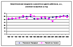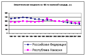 Уровень развития материально-технической базы характеризуется в первую очередь обеспеченностью энергетическими мощностями и сельскохозяйственной техникой. Обеспеченность сельского хозяйства Хакасии энергетическими мощностями в расчете на одного работника и на 100 га посевной площади находится на уровне среднего по России, а с 2000 г. в расчете на 100 га посевной площади даже превышает его (рис. 2).