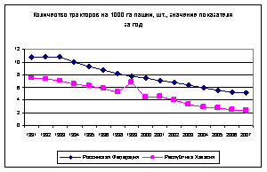 В целом, если делать выводы на основе сравнения со средними значениями по стране, ситуация не выглядит критической на фоне общей картины. Но соответствие среднеотраслевым и прочим средним показателям не говорит о том, что в отрасли все благополучно. Наоборот, это означает, что все так же плохо, как и в остальных регионах страны. Так, например, количество тракторов относительно площади пашни с 1991 г. упало в Российской Федерации в 2.2 раза, в Хакасии в 3.2 раза. Данных об уровне износа сельхозтехники нет, но можно предположить, что износ значительный.
