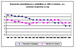 По количеству тракторов на 1000 га пашни Хакасия отстает от среднестатистических показателей, но количество зерноуборочных комбайнов с 2003 г. наоборот, превысило средний уровень по стране (рис. 3).