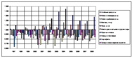 В таком состоянии сельское хозяйство не обеспечивает население Хакасии даже продуктами питания в достаточном количестве. Сравнение опять же со среднероссийскими показателями потребления продуктов питания показывает, что особенно заметно население Хакасии отстает в потреблении рыбы и рыбопродуктов, яиц, мяса и мясопродуктов. По всем остальным группам отставание не так значительно, но уровень потребления составляет лишь 91% от среднего. На рис. 4 приведены значения показателя, рассчитанного как отношение среднедушевого потребления продуктов питания (все домашние хозяйства, за год) в Республике Хакасия к аналогичному показателю по Российской Федерации. За последние двенадцать лет население Хакасии потребляло выше среднего уровня только картофель и растительное масло! В отдельные годы чуть выше среднего потреблялось молока и овощей.