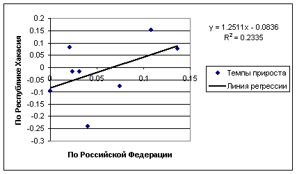По данным Росстата были рассчитаны темпы прироста ВРП за гг. по России в целом и по Республики Хакасия по виду экономической деятельности «Сельское хозяйство, охота и лесное хозяйство» (только по сельскому хозяйству данных нет, но охота и лесное хозяйство занимают незначительную долю). Было получено уравнение регрессии следующего вида[8]: