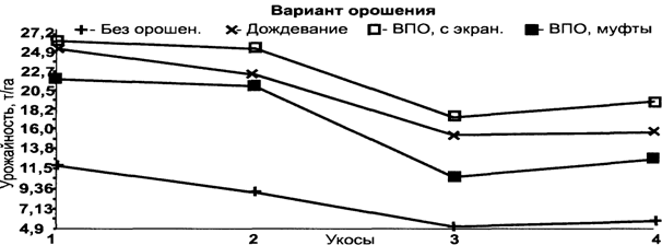Сравнивая поукосный урожай люцерны при дождевании и ВПО, следует заметить, что при ВПО наблюдается меньше колебаний урожайности от первого до последнего укоса. Разность между величиной урожая в первом и последнем укосе в среднем составила при дождевании 9,7, а при ВПО - 6,1 т/га.