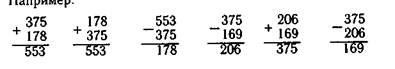При выполнении действий на сложение и вычитание в пределах 1000 решаются примеры с тремя компонентами без скобок и с круглыми скобками: 375+36+124; 379+(542-276); 4, 375+186-264, +136. Решаются также примеры на нахождение неизвестных компонентов действий. Проверка выполняется двумя действиями.