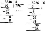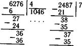Разделим 6276 на 6; 6 единиц тысяч будем делить на 6. Возьмем по 1. В частном получится четырехзначное число. Ставим 4 точки 1 ед. тыс. умножим на 6, получим 6. Проверим вычитанием, все ли тысячи разделились. Остатка нет. Делим 2 сотни на 6, 2 сотни не де лятся на 6, поэтому на месте сотен пишем в частномдесятком делим на 6. Возьмем по 4». И т. д. При делении многозначного числл на однозначное рассматриваются и случаи деления с остатком, например 2487:7. Важно постоянно обращать внимание учащихся на то, что оста ток должен быть меньше делителя.