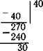 Затем вводится деление на круглые десятки, сотни и тысячи с остатком. Например: 670:40. В частном будет двузначное число. В частном берем по 1, умножаем 1 на 40. Вычитаем 67—40=делим на 40. Сначала делим 270 и 40 на 10. Затем делим неполное делимое и делитель: 27:4. Берем по 6. Умножаем 6 на 40, получаем 240. Вычитаем. Остаток 30 (меньше 40), частное 16.