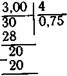 Рассуждение: «3 на 4 не делится нацело. В частном пишем нуль целых и ставим после нуля запятую. Раздробляем 3 в десятые доли. 30 десятых делим на 4. В частном пишем 7 десятых. В остатке 2 десятых. Раздробим 2 десятых в сотые доли. Получим 20 сотых. Делим на 4. В частном 5 сотых.