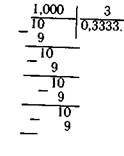 Но не всегда этим способом можно (при замене обыкновенной дроби десятичной) выразить знаменатель обыкновенной дроби 1 с несколькими нулями. Возьмем, например, дробь - я-. Попробуем взять знаменаОн не подходит, так как нельзя в данном случае получить дополнительный множине делится нацело на 3. То же получим, если возьмем знамена, 1000. Следовательно, дробь -^ нельзя этим способом выразить десятичной дробью.