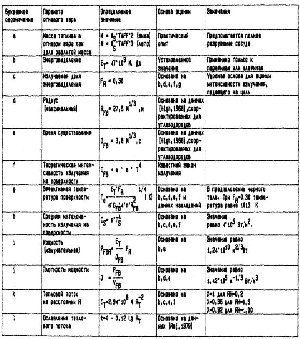 При оценке энерговыделения огневого шара возникают неточности, причиной которых являются: а) неопределенность отношения MFB/MS, и б) неопределенность в эффективности сгорания. Предположения о том, что MFB/MS = 1 и что происходит полное сгорание, можно считать пессимистическими. Согласно теории, интенсивность излучения зависит также от DFB - времени существования огневого шара, и, следовательно, точность, с которой она может быть вычислена, не превышает точности уравнений. Однако воздействие на окружающую среду характеризуется, по крайней мере приблизительно, количеством излученной энергии, т. е. произведением интенсивности и длительности; и, таким образом, влияние неточности в оценке длительности в некоторой степени компенсируется, если говорить о результате произведения.