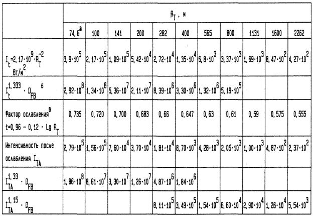 В табл. 8.15 представлены значения It, основанные на работе [Raj,1979], при условии, что относительная влажность равна 50%. Далее вычисления проведены уже с учетом ослабления и соответствуют дозе несмертельного поражения.