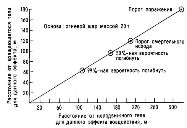 Вращение на 360° для человека, подвергшегося действию излучения огневого шара, маловероятно, но приводимые для случая такого вращения расстояния, по-видимому, находятся в большем соответствии с реальными эффектами воздействия облучений. Кроме того, вычисления не учитывают уменьшение в дозе облучения, получаемой бегущим человеком. Таким образом, согласно японским данным, длительность импульса приближается к 1,5 с, что близко к значениям, цитируемым Айзенбергом и др. (Отметим, что соотношение интенсивность/время для светового импульса ядерного оружия заметно отличается от прямоугольного импульса.)