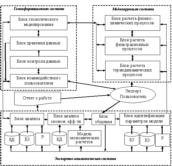 ЭАС состоит из трех блоков. Блок идентификации параметров моделирования предназначен для определения значений параметров, необходимых для осуществления компьютерных расчетов эволюции состояния гидрогеологической системы, и включает в себя решатель и базы данных и знаний. База данных предназначена для хранения значений параметров и характеристик гидрогеологической системы. Содержимое базы знаний представляет собой набор правил, позволяющих решателю на основе модели геологической среды определять параметры моделирования. Блок анализа предназначен для оценки состояния гидрогеологической среды и выработки рекомендаций для подготовки управляющих воздействий. Он включает решатель, базы данных и знаний. База данных содержит критерии оценки состояния и эволюции гидрогеологической системы. В базе знаний находится набор продукционных правил. Решатель на основе базы знаний проводит экспертные оценки и анализ состояния и эволюции природно-антропогенной гидрогеологической системы, оценку геотехнологических показателей (область загрязнения токсичными и радиоактивными веществами в подземных горизонтах, превышение предельно допустимых значений концентраций загрязняющих веществ и т. д.), выработку оптимальных управленческих решений на основе имеющихся данных. Блок общения предназначен для управления работой ЭАС, формирования запросов пользователя, редактирования и заполнения баз данных и знаний, подготовки отчетной документации.