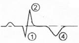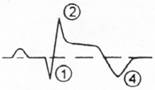 2 – низкоамплитудный зубец R; 3 – «возвышение» сегмента ST; 4 – отрицательный зубец T.