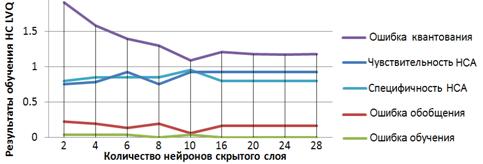 В результате получены зависимости влияния следующих параметров на качество обучения и определены их значения по критерию оптимальности оценки качества обучения НС LVQ: число входов НС – 150; количество нейронов скрытого слоя – 42; число выходов НС – 3; значения коэффициентов избыточности, зашумления, нормирования и сдвига – 10, 3, 1, 2 соответственно; число сигналов в обучающей выборке – 60; значение порога штрафования – 10; количество эпох обучения – 15.
