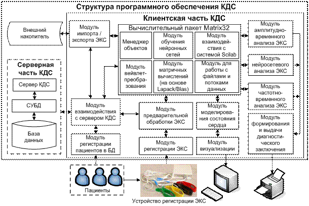 На рисунке 7 представлена разработанная структура программного обеспечения КДС, которая на основе технологии «клиент-сервер» обеспечивает все этапы анализа ЭКС для диагностики ИМ. Особенностью разработанной структуры является возможность интеграции с медицинскими информационными системами, действующими в учреждениях здравоохранения. Кроме того, разработанная структура позволяет автоматизировать процесс анализа ЭКС для диагностики ИМ, обеспечивая принципиальную возможность исключить необходимость присутствия врача при формировании диагностического заключения.