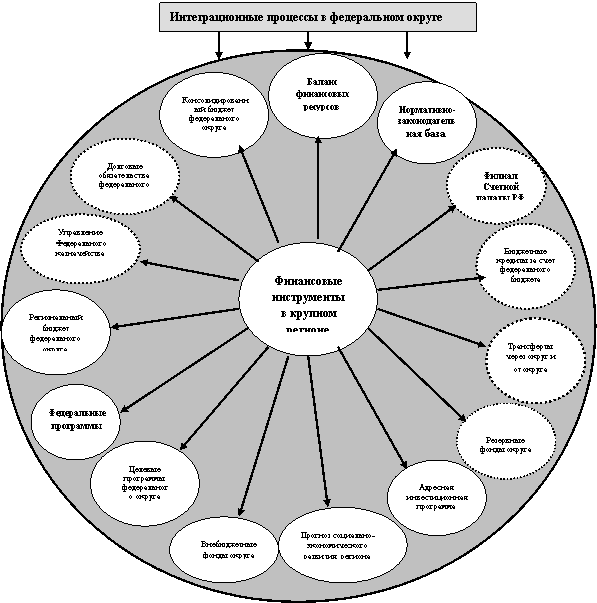 На рис. 4 показано, каким примерно инструментарием, позволяющим воздействовать на экономические, бюджетные, социальные процессы в крупном регионе всех входящих в него субъектов РФ, всего населения федерального округа, может располагать индикативная финансовая система округа.