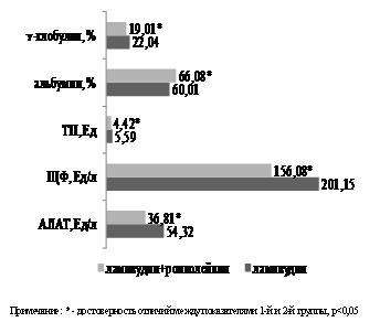 Рис. 1. Динамика основных показателей метаболизма печени у больных с рецидивом HBeAg - ХГВ в разных группах лечения.