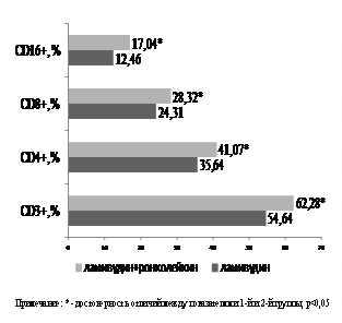 Для выявления патогенетического значения изменений клеточного звена иммунитета в развитии рецидива заболевания проводилось иммунологическое исследование уровней экспрессии мембранных антигенов СD3+, СD4+, СD8+, СD16+ лимфоцитов периферической крови у больных в двух группах до лечения ламивудином и через 12 мес. после лечения.