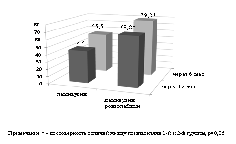Эффективность ПВТ оценивалась также в двух группах, как на фоне терапии, так и после её прекращения. При комбинированной терапии (ламивудин + ронколейкин) у больных с рецидивом HBeAg-негативного ХГВ первичный ВО был получен у 88,7% больных, непосредственный ВО - у 90,6% пациентов, что указывает на высокий фармакотерапевтический эффект.