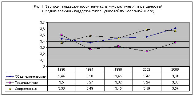 Смысловое ядро самосознания широких слоев населения образуют их базовые ценности. Программа и методика нашего мониторинга позволяют измерять уровень поддержки населением 14 базовых ценностей. Они представляют три цивилизационных типа (общечеловеческие, традиционные, современные) и два функциональных слоя (терминальные и инструментальные), которые спонтанно эволюционируют в массовом сознании. Пять волн мониторинга (1990, 1994, 1998, 2002, 2006 годы) устойчиво демонстрируют факт в целом паритетного совмещения в сознании россиян всех трех цивилизационных типов ценностей (см. рис. 1). Они взаимодействуют, а их поддержка населением постепенно изменяется, но в узком диапазоне: от 3,4 до 3,6 баллов. Одновременно сложился плюрализм ценностных позиций: от повседневного гуманизма до корыстного властолюбия; на разных этапах число основных позиций колеблется от 11 до 15. В этом отражается своеобразие менталитета россиян, их европейско-азиатское положение, исторические особенности социокультурной эволюции России.