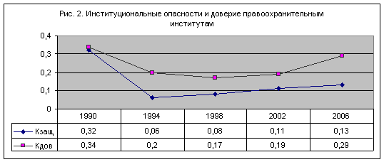 (суд, прокуратура, милиция) рассматриваем как зависимую переменную, своего рода индикатор их эффективности. Из рис. 2 видно, что защищенность населения от опасностей, исходящих от данных институтов, к 1994 г. упала более чем в 5 раз по сравнению с 1990 г. и второе десятилетие продолжает оставаться на критически низком уровне, хотя к 2006 г. она немного поднялась. Отмеченный выше оптимизм россиян проявился в том, что их доверие выросло в большей степени, чем их защищенность от произвола этих институтов. Тем не менее, это доверие еще не достигло уровня 1990 г., а тогда он далеко не обеспечивал устойчивость общества, распавшегося в конце 1991 г.