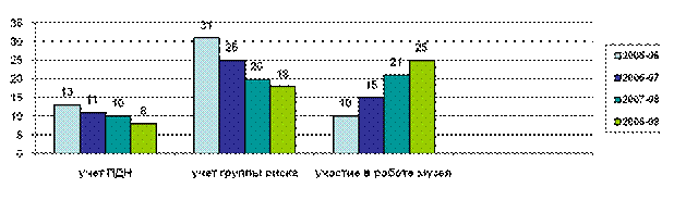 Динамика показателей учета ПДН, группы риска и участия в музейной работе «трудных» учащихся Хатасской СОШ.