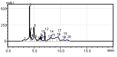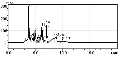 Суммарную фракцию антибиотиков получали глубинным культивированием штаммов в жидких средах различного состава. Культуральную жидкость добавляли в агаризованную питательную среду, поверхность которой засевали конидиями грибов и затем учитывали их прорастание. Для получения порошка метаболитов, содержащих антибиотики, культуральную жидкость подкисляли 6N HCl до рН 2,0. Осадок отделяли центрифугированием, перерастворяли в 96%-ном этаноле, центрифугировали, надосадок упаривали. Экстракты из нейтрализованного после подкисления остатка культуральной жидкости и вегетативных клеток штаммов получали, используя в качестве экстрагентов хлороформ и метанол. Анализ антибиотиков проводили методом высокоэффективной жидкостной хроматографии (ВЭЖХ) на хроматографе Shimadzu LC-20 (Shimadzu, Япония) с диодноматричным детектором. Две колонки Luna Silica 250х4,6 мм, 5 мкм (Phenomenex, США) соединяли последовательно. В качестве подвижной фазы использовали элюент состава ацетонитрил:вода=85:15. Скорость потока составляла 1 мл/мин. В качестве стандартов использовали сурфактин и итурин (Sigma, США).