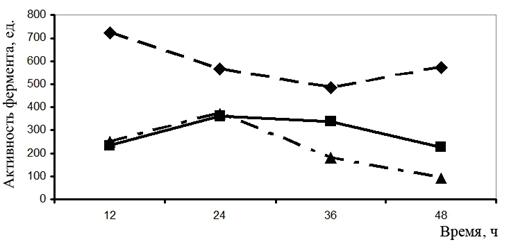 использовали, соответственно, ламинарин, коллоидный хитин из панцирей крабов, карбоксиметилцеллюлозу, яблочный пектин (Sigma, США). Активность протеаз определяли с азоказеином (Sigma, США) (Griffen et al., 1997).