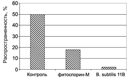 Интересными также оказались данные, полученные при оценке распространенности корневых гнилей укропа (рис. 4). Штамм 11В проявил хорошие защитные свойства, несмотря на невысокую антагонистическую активность in vitro. Эти данные