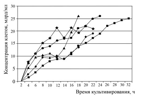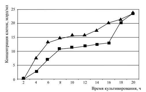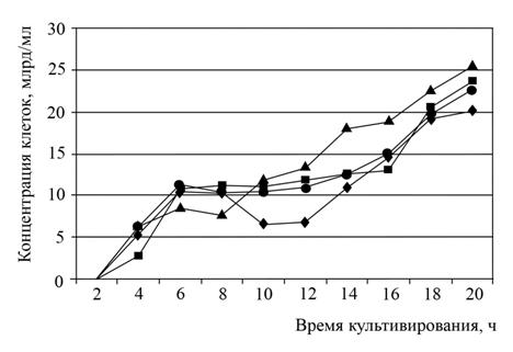 Рис. 7. Динамика роста концентрации клеток штаммов B. subtilis 26Д (